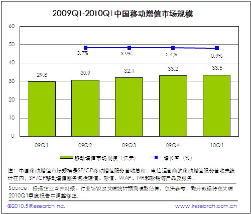 電信運(yùn)營商計(jì)費(fèi)政策重大調(diào)整對(duì)整個(gè)移動(dòng)增值市場產(chǎn)生巨大影響力,2010Q1移動(dòng)增值市場規(guī)模為33.5億,與09Q1基本持平。電信運(yùn)營商實(shí)施計(jì)費(fèi)通道的強(qiáng)力治理措施,對(duì)產(chǎn)品線以WAP計(jì)費(fèi)為主的企業(yè)造成嚴(yán)重生存壓力,與此同時(shí)采用短信計(jì)費(fèi)的移動(dòng)增值產(chǎn)品營銷也受到不同程度影響。實(shí)現(xiàn)由單一移動(dòng)增值業(yè)務(wù)向移動(dòng)互聯(lián)網(wǎng)服務(wù)進(jìn)行戰(zhàn)略轉(zhuǎn)型,是SP企業(yè)戰(zhàn)略發(fā)展的實(shí)踐路徑。艾瑞認(rèn)為電信運(yùn)營商實(shí)施全新的合作伙伴計(jì)費(fèi)政策,將重新構(gòu)建移動(dòng)增值市場秩序。