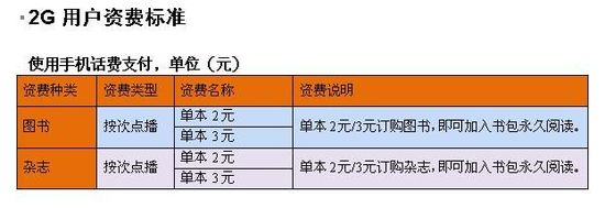 據(jù)了解,中國聯(lián)通手機閱讀業(yè)務(wù)只針對聯(lián)通網(wǎng)內(nèi)手機用戶,采用按次點播(按本訂購)的資費標準。同時,2G用戶和3G用戶采用不同的支付方式,2G用戶使用手機話費支付,3G用戶使用M/T支付。