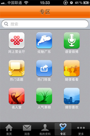 記者在測試中發(fā)現(xiàn),聯(lián)通語音微博整體界面為醒目的聯(lián)通標準色,并內置了聯(lián)通專區(qū)、聯(lián)通網(wǎng)上營業(yè)廳、廣東聯(lián)通炫魅廣東等定制應用服務。