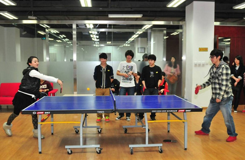 (十八) 5點(diǎn)鐘了啦,可以下班了喔,還是A班的我們幸福,晚班可就熬人啦,但不少時(shí)候?yàn)榱斯ぷ骱臀覀兊能囍骺蛻簦倳低档恼f,“為人為己服務(wù)至上,有付出就會有回報(bào)……”下班時(shí)間約了同事在公司B2打乒乓球哦~勞逸結(jié)合,放松下,現(xiàn)場觀眾很多的,男同胞很捧場,哈哈。