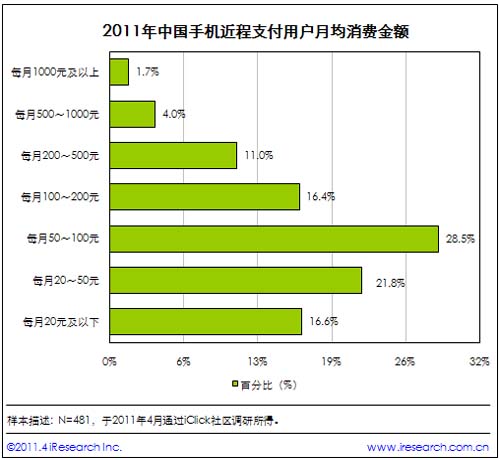 根據(jù)艾瑞咨詢(xún)近期發(fā)布的《2011年中國(guó)新興線(xiàn)下支付行業(yè)研究報(bào)告》的研究數(shù)據(jù)顯示,中國(guó)手機(jī)支付發(fā)生的場(chǎng)景主要集中在超市、便利店和商場(chǎng)等場(chǎng)所;并且,目前的中國(guó)用戶(hù)的手機(jī)支付金額,都以100元及以下的小額支付為主。