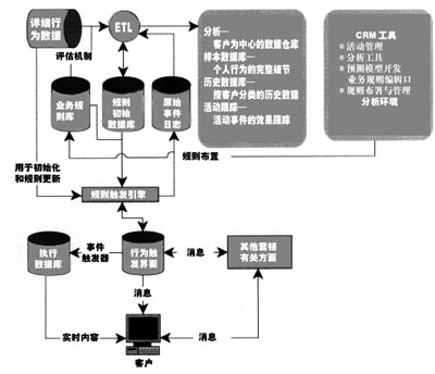 關系數(shù)據庫系統(tǒng)有三種主要數(shù)據:典型客戶案例的詳細數(shù)據、對所有客戶的總結性歷史數(shù)據以及具體活動的數(shù)據。分析數(shù)據庫提供輸入數(shù)據,從而得到對客戶的認識,而滿足ETL處理的業(yè)務規(guī)則庫為分析數(shù)據庫提供派生屬性。這個過程將保持離線分析和實時事件觸發(fā)規(guī)則之間的同步,在動態(tài)建立表格的過程中處理初始化完成后的派生屬性相加,并對相應的元數(shù)據進行更新,這些處理都是自動實現(xiàn)的。