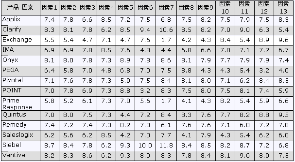 下表摘自Gartner Group 2000年六月份對14種CRM廠商和產(chǎn)品的比較。原來的報告以柱狀圖的形式進(jìn)行比較,為了縮短篇幅,我們轉(zhuǎn)化為表格形式借以引用。