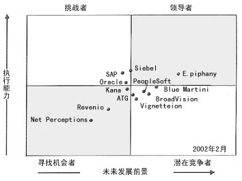 Siebel 和Oracle因?yàn)樵谄銫RM中整合了E-Marketing以及公司強(qiáng)大的資金實(shí)力,因此在挑戰(zhàn)者中最為引人注目。預(yù)計(jì)Siebel 將在6到12個(gè)月內(nèi)進(jìn)入E-Marketing市場的領(lǐng)導(dǎo)者行列。SAP首次出現(xiàn)在這一群體之中,但是它的強(qiáng)項(xiàng)在于其產(chǎn)品易于與已安裝的其它軟件相集成,而不是其E-Marketing的功能,這一點(diǎn)限制了那些沒有購買過SAP產(chǎn)品的企業(yè)接受其產(chǎn)品。