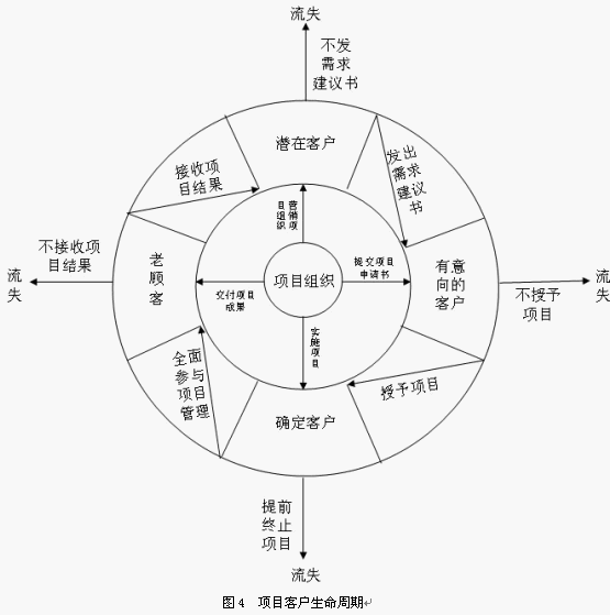 在傳統(tǒng)的項(xiàng)目管理中,項(xiàng)目組織往往不能分清客戶(hù)生命周期,對(duì)不同階段沒(méi)有清楚的認(rèn)識(shí),對(duì)于所采取的措施也不能很好的令客戶(hù)滿(mǎn)意。引起了客戶(hù)與組織之間的溝通障礙,不利于客戶(hù)對(duì)項(xiàng)目的實(shí)時(shí)控制,造成了最終對(duì)項(xiàng)目交付物的不接受或是不滿(mǎn)意。而且,目前我國(guó)的情況還有就是,只重視第三階段客戶(hù)參與項(xiàng)目管理過(guò)程—該階段對(duì)應(yīng)項(xiàng)目生命周期—而忽視對(duì)潛在客戶(hù)的培養(yǎng),與老顧客的關(guān)系建設(shè)等。項(xiàng)目組織應(yīng)該從自身長(zhǎng)遠(yuǎn)利益出發(fā),從提升市場(chǎng)競(jìng)爭(zhēng)力角度出發(fā),通過(guò)實(shí)現(xiàn)客戶(hù)全面滿(mǎn)意贏得市場(chǎng)聲譽(yù),從而在激烈的市場(chǎng)競(jìng)爭(zhēng)中立于不敗之地。