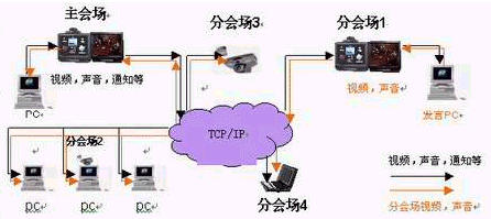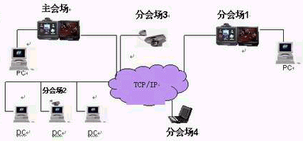 可視化Ip電話會議系統(tǒng): 是利用計算機,多媒體通信技術(shù)和設(shè)備,通過傳輸信道在兩地或多個地點之間開會的一種通信手段。在召開會議時,處于兩地或不同地點的與會代表,既可以聽到對方的聲音,又可以看到對方的形象,同時還能看到對方會議室的場景,以及在會議中展示的事物、圖片、表格、文件等,縮短了與會代表的距離,使大家好像在同一會議室參加會議一樣。它的廣泛應(yīng)用必然產(chǎn)生巨大的社會效益和經(jīng)濟效益。系統(tǒng)結(jié)構(gòu)簡圖如下: