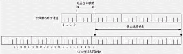 D類地址的最后28比特沒有結(jié)構(gòu)化,即沒有網(wǎng)絡(luò)ID和主機ID之分。響應(yīng)某一個IP多播地址的主機構(gòu)成一個主機組,主機組可跨越多個網(wǎng)絡(luò)。主機組的成員數(shù)是動態(tài)的,主機可以通過IGMP協(xié)議加入或離開某個主機組。IP多播地址影射到以太網(wǎng)地址的方法見下圖。因為IP多播地址的高5位未影射,因此,影射的以太網(wǎng)地址不是唯一的,共有32個IP多播地址影射到一個以太網(wǎng)地址。