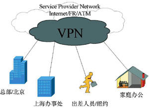 在如圖2所示的VPN 示意圖中,可以看出,VPN所賴以運(yùn)行的公網(wǎng)平臺(tái)可以包括各種實(shí)際的網(wǎng)絡(luò),例如IP網(wǎng)、幀中繼網(wǎng)、ATM網(wǎng),也可以就是因特網(wǎng)(Internet),因而也表明其網(wǎng)絡(luò)的范圍可以包括多個(gè)服務(wù)商。從地理范圍上看,VPN可以延伸到所有互相聯(lián)網(wǎng)的服務(wù)商所覆蓋的范圍。從用戶接入方式看,VPN可以包括服務(wù)商所提供的所有接入方式,如專線接入、撥號(hào)接入、無(wú)線連接等。