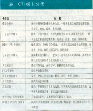 。。一般情況下,語(yǔ)音卡都是按功能來(lái)命名和劃分種類的。右表列出了按功能劃分的各種類型的CTI板卡。