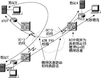 這個(gè)例子中,OC-3 ATM連接配置上3 Mbps PVCsL連到不同的遠(yuǎn)程位置。RSVP確保QOS從這個(gè)PVC通過當(dāng)?shù)氐木W(wǎng)絡(luò)路由連到正確的使用地。