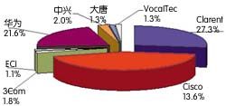 從圖3可以看出, Cisco、Clarent 和華為已經(jīng)成為我國IP電話設備市場的主要供應商。