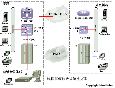 圖中紅色實(shí)線表示通過(guò)IP網(wǎng)絡(luò)傳輸語(yǔ)音的線路,藍(lán)色虛線表示通過(guò)PSTN傳輸語(yǔ)音的線路。由于通過(guò)IP網(wǎng)絡(luò)沒(méi)有使用額外的長(zhǎng)途線路,所以降低了遠(yuǎn)程會(huì)議系統(tǒng)的運(yùn)行成本。同時(shí)VoIP傳輸系統(tǒng)支持普通的長(zhǎng)途電話呼叫,為客戶節(jié)省長(zhǎng)途電話開支。