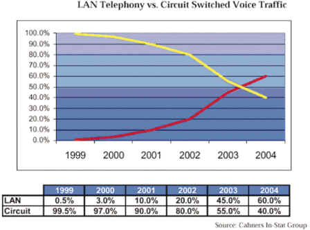 Group的資料顯示,LAN Telephone與Circuit Switched Voice Traffic比較圖,呈現(xiàn)數(shù)據(jù)網(wǎng)絡的占有率將在二至三年后,首度超越語音網(wǎng)絡的流量占有率。因此,不論是盤據(jù)傳統(tǒng)電信市場大廠如Lucent及Nortel,或是代表網(wǎng)絡新興勢力的Cisco,也都在積極爭搶這塊新領域的主導權。于是,有人說,「IP