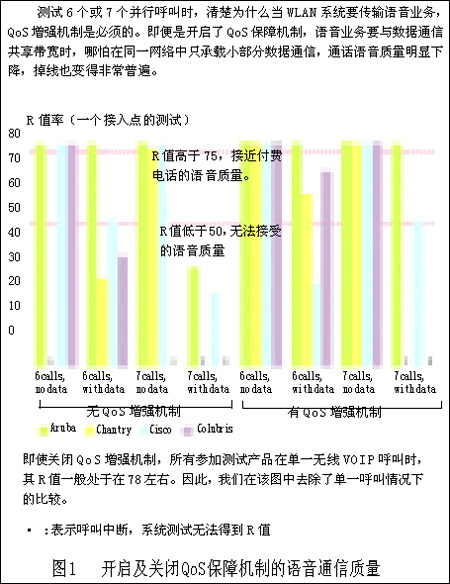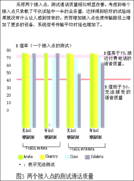 而其他供應(yīng)商的設(shè)備在開啟QoS保障機(jī)制的情況下,一旦加入數(shù)據(jù)流業(yè)務(wù),就很難保證通話質(zhì)量。從正面來(lái)看,在只有語(yǔ)音傳輸業(yè)務(wù)的情況下,QoS保障機(jī)制一般運(yùn)行較好。當(dāng)我們只承載語(yǔ)音傳輸時(shí),所有系統(tǒng)的音頻質(zhì)量都改善了。在不加入數(shù)據(jù)流情況下測(cè)試6個(gè)或7個(gè)并行VoIP呼叫,所有的系統(tǒng)都能夠取得和付費(fèi)電話一樣的通話質(zhì)量。但當(dāng)我們加入數(shù)據(jù)流業(yè)務(wù),一切都改變了。在承載6個(gè)并行VoIP呼叫并加入數(shù)據(jù)流業(yè)務(wù)的情況下,Colubris CN1250系統(tǒng)的R值衰落到70以下。根據(jù)ITU的R值標(biāo)準(zhǔn),這說(shuō)明一些用戶的通話質(zhì)量不令人滿意。Chanrty的R值在60左右,這個(gè)結(jié)果將不能令用戶滿意。除了客觀的R值評(píng)分以外,我們還進(jìn)行了一些主觀的通信質(zhì)量監(jiān)聽,當(dāng)加入了數(shù)據(jù)流業(yè)務(wù)以后,我們聽到了大量的回聲,掉線頻繁?傊灰獪y(cè)試點(diǎn)加入數(shù)據(jù)業(yè)務(wù)流,上面描述的情況就會(huì)出現(xiàn),通話質(zhì)量通常變得惡劣。