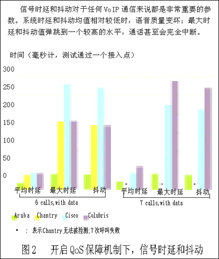 而當(dāng)我們通過(guò)一個(gè)接入點(diǎn)或交換機(jī)傳送6到7個(gè)并行VoIP呼叫時(shí),尤其是加入了數(shù)據(jù)通信業(yè)務(wù)后,所有產(chǎn)品的系統(tǒng)性能顯著降低。另外,當(dāng)開通7個(gè)并行VoIP呼叫和關(guān)閉QoS保障機(jī)制時(shí),即使沒有加入數(shù)據(jù)業(yè)務(wù), Colubris設(shè)備也幾乎都處于通話中斷的狀態(tài)。因此,我們無(wú)法得到任何測(cè)試數(shù)據(jù)(如圖1所示)。