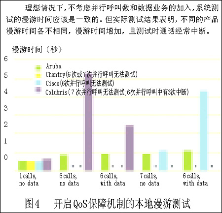 在關(guān)閉QoS保障機(jī)制時(shí),Chantry和Colubris系統(tǒng)在承載7個(gè)并行VoIP呼叫時(shí),所有的通話都中斷,不能進(jìn)行有數(shù)據(jù)流業(yè)務(wù)加入的VoIP語(yǔ)音測(cè)試。