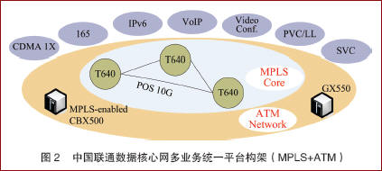 中國(guó)聯(lián)通IP電話網(wǎng)的承載網(wǎng)分為核心層和區(qū)域?qū)觾杉?jí)結(jié)構(gòu),核心層由北京、上海、廣州、沈陽、武漢、西安和成都7個(gè)大區(qū)節(jié)點(diǎn)組成;區(qū)域?qū)影锤鞣止緟^(qū)域分布情況,劃分為22個(gè)區(qū)域。建網(wǎng)初期,承載網(wǎng)采用ATM+IP/VPN組成IP電話專用傳輸網(wǎng),確保IP承載層的QoS,網(wǎng)絡(luò)性能符合聯(lián)通測(cè)試指標(biāo)。下一階段,中國(guó)聯(lián)通數(shù)據(jù)核心網(wǎng)的技術(shù)演進(jìn)路線方向如圖2所示。網(wǎng)絡(luò)將以MPLS+ATM為核心技術(shù),在7大核心節(jié)點(diǎn)建設(shè)功能強(qiáng)大的MPLS核心網(wǎng)絡(luò),同時(shí)采用2層MPLS技術(shù),實(shí)現(xiàn)與ATM設(shè)備的透明連接,從而構(gòu)建一個(gè)多協(xié)議、多業(yè)務(wù)同時(shí)兼顧IPv4/IPv6發(fā)展的先進(jìn)網(wǎng)絡(luò)。中國(guó)聯(lián)通的互聯(lián)網(wǎng)、數(shù)據(jù)專線、IP電話、視頻會(huì)議、IPv6網(wǎng)絡(luò)、CDMA1X數(shù)據(jù)通信網(wǎng)等都承載在統(tǒng)一的數(shù)據(jù)傳送平臺(tái)之上。