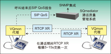 圖2顯示了如何在IP網(wǎng)絡(luò)上使用行業(yè)標(biāo)準覆蓋質(zhì)量管理系統(tǒng)。圖中顯示了嵌入式軟件探測裝置,如IP話機中的行業(yè)標(biāo)準VQMon代理,它們可實時監(jiān)測通話質(zhì)量。這些代理可生成RTCP