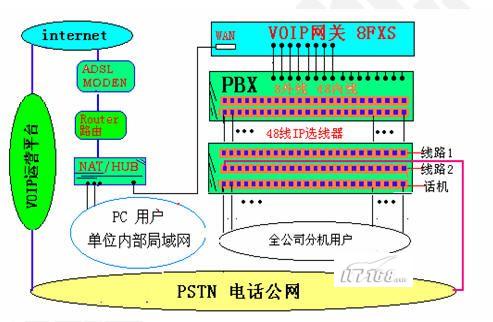 如果現(xiàn)有網(wǎng)絡(luò)接入方式為ADSL寬帶撥號(hào)上網(wǎng),全公司共享上網(wǎng)使用,如果想要支持超過(guò)4人以上同時(shí)通話(huà),為了使數(shù)據(jù)和語(yǔ)音互相不爭(zhēng)用帶寬,必須考慮另外申請(qǐng)一條ADSL。下圖為PBX、VOIP、選路器接線圖: