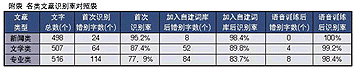 然后,我們又利用聲龍?zhí)赜械脑~匯生成器,讓聲龍自行辨別文章中的詞匯并自動添加到自建詞庫中,并針對其中的一些英文單詞或縮寫對聲龍進行語音識別訓練,之后我們再次錄入同一篇專業(yè)文章。結果非常令人滿意,從附表可以看出識別率有了明顯提高。最后,我們又錄入了另一篇相同領域的專業(yè)文章中的一段(512字)。首次錄入的錯別字有46個,識別正確率為91%。與第一篇文章相比,識別率有了明顯提高。