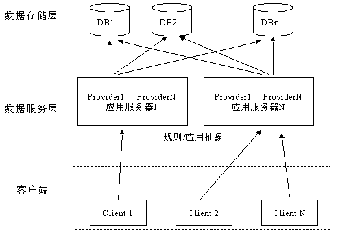 在大規(guī)模系統(tǒng)中,為保證數據庫訪問的效率和安全性,數據訪問方式一般采用由Client、中間層應用服務器(或叫規(guī)則服務器)和Server組成的三層Client/Server結構。將數據庫應用劃分為邏輯上的三個層次,客戶程序只關心數據的顯示與用戶界面;應用服務器處理客戶數據查詢與更新請求,可在應用服務器上定義數據操作規(guī)則以保證數據操作的合法性、安全性與有效性。在三層結構下,方便了軟件的修改和模塊的疊加,客戶端通過應用服務器訪問數據庫服務器,客戶端并不直接與數據庫服務器建立連接,從而減輕了數據庫服務器的壓力,提高整個應用系統(tǒng)的運行效率。