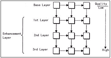 關于分層可擴展性編碼的研究可以追溯到10年前,目前它已經被許多現(xiàn)行的國際壓縮標準接納,例如H.263+和MPEG-4。分層可擴展編碼主要有三種:時域可擴展性、空域可擴展性和質量可擴展性。其中質量可擴展性也稱為PSNR可擴展性,原因是視頻質量通常用峰值信噪比(PSNR)來衡量。