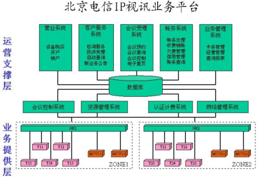 在整個(gè)運(yùn)營(yíng)支撐層的系統(tǒng)中,主要包括四大系統(tǒng),即會(huì)議控制系統(tǒng)、資源管理系統(tǒng)、認(rèn)證計(jì)費(fèi)系統(tǒng)、網(wǎng)絡(luò)管理系統(tǒng)。除此之外,還有其它幾個(gè)輔助系統(tǒng),包括營(yíng)業(yè)系統(tǒng)負(fù)責(zé)為客戶開(kāi)戶和銷戶,終端注冊(cè)等處理;客戶服務(wù)系統(tǒng)提供咨詢服務(wù)、投訴受理、自動(dòng)查詢和幫助客戶進(jìn)行會(huì)議預(yù)約,在資源不足的情況下進(jìn)行會(huì)議調(diào)度等;會(huì)議受理系統(tǒng)是面向客戶提供會(huì)議電視業(yè)務(wù)預(yù)約、會(huì)議狀態(tài)查詢、會(huì)議控制服務(wù),由用戶自助完成預(yù)約會(huì)議和控制會(huì)議的操作;賬務(wù)系統(tǒng)負(fù)責(zé)賬務(wù)方面的管理,包括賬務(wù)管理,收費(fèi)銷賬,催繳欠費(fèi)、銀行繳費(fèi)等;業(yè)務(wù)管理系統(tǒng)主要是記賬卡的卡務(wù)處理、經(jīng)營(yíng)管理、查詢報(bào)表等。