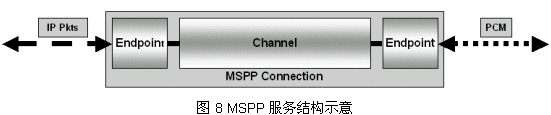 MSPP運行在FusionTM環(huán)境下,意即Media Stream Processing Protocol,媒體流處理協(xié)議,它為各種業(yè)務間的數(shù)據(jù)轉換/交互提供了一種可能。它相當于一個中間代理(Agent),通過標準的入口/出口終結點(Entry and Exit Endpoint)和端到端連接(End-End Connection)完成異種網(wǎng)絡間的格式化數(shù)據(jù)(Formatted Data)傳遞功能,見圖8。MSPP包含兩個基本組件:終結點(Endpoint)和通道(Channel),異種網(wǎng)絡間通過這兩種組件構成的連接(Connection)完成。