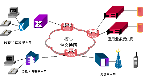 未來的網(wǎng)絡(luò)將會(huì)以基于數(shù)據(jù)包的網(wǎng)絡(luò)為核心,交換系統(tǒng)以IP交換和ATM交換等構(gòu)成,能實(shí)現(xiàn)包括語音、數(shù)據(jù)和視頻的所有交換需求。各種接入網(wǎng),如:無線網(wǎng)、有線電纜網(wǎng)、DSL、TDM(時(shí)分多路復(fù)用)交換網(wǎng)等,通過路由器接入到核心網(wǎng)絡(luò)。