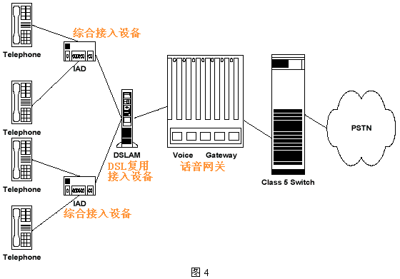 圖4給出了BLES的邏輯結構。這種方式下,VoDSL廠商必須設計開發(fā)用于和已有的用戶設備、DSL網絡及Class 5交換機互通的接口設備;用戶側設備IAD為數據傳輸提供了Ethernet和ATM接口,為話音傳送提供了一定數量的模擬用戶線接口,每一接口都被分配了唯一的DSL電路。話音網關和Class 5交換機間的接口協議,在美國等地區(qū)采用GR-303和TR-08標準,而在歐洲標準中使用V5.2接口。參見后面的圖6。