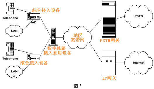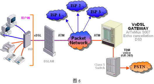 這種方式又稱為VoMBN/VoMSBN(Voice over Multi-service Broadband Network)。圖5給出了MSDN的邏輯結構這種方式下,DSL本地環(huán)路和PSTN及Internet間的互聯不再通過Class 5交換機,而由地區(qū)寬帶多業(yè)務網絡代替,從用戶側看仍和Class 5 交換機等效,當其功能復雜得多。這個網絡可以是基于IP或ATM的,它包含信令系統(tǒng)和呼叫處理服務器及各種網關設備。
