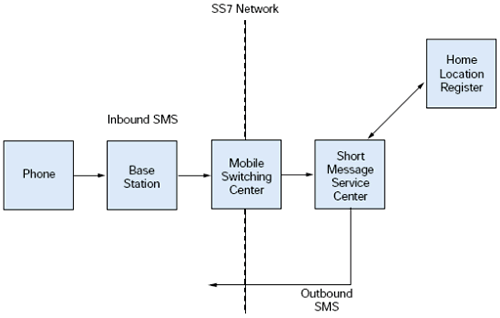 從MSC, SMS消息在SS7網(wǎng)絡(luò)中發(fā)送到短消息中心(SMSC), 一個網(wǎng)絡(luò)的標(biāo)準(zhǔn)部分. SMSC向Home Location