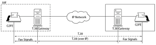 注意: T.38協(xié)議本身直接在收發(fā)網(wǎng)關(guān)之間運行。呼叫建立、電傳設(shè)備和網(wǎng)關(guān)之間其他通信或者電傳設(shè)備之間或者其他設(shè)備之間的通信不在T.38協(xié)議范圍內(nèi)。